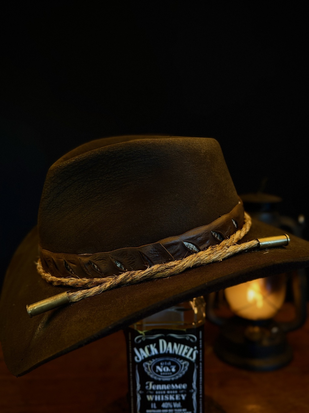Mergulhe na essência do Velho Oeste com o Chapéu Bullet Trail, uma peça exclusiva e feita à mão por Henrique Maia, que traz à tona o espírito indomável dos foras-da-lei das terras áridas e selvagens do deserto.